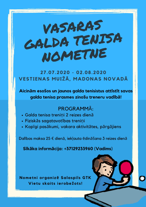 Sākusies pieteikšanās Salaspils galda tenisa kluba organizētai vasaras nometnei Vestienā, kurā notiks no 27. jūlija līdz 2. augustam (7 dienas). Nometnē darbosies trīs sertificētie Salaspils galda tenisa kluba treneri - Baiba Bogdanova, Ilva Baltute un Vadims Berežkovs. Vietu skaits nometnē ierobežots un priekšroka tiks dota tiem, kuri nometnei pieteikušies ātrāk. Sīkāka informācija: tel. +37129233960 Vadims).
