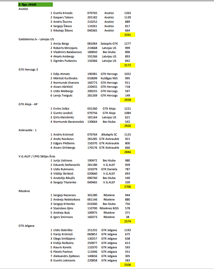 Vīrieši, 2. līga Rezultāti Kopvērtējums