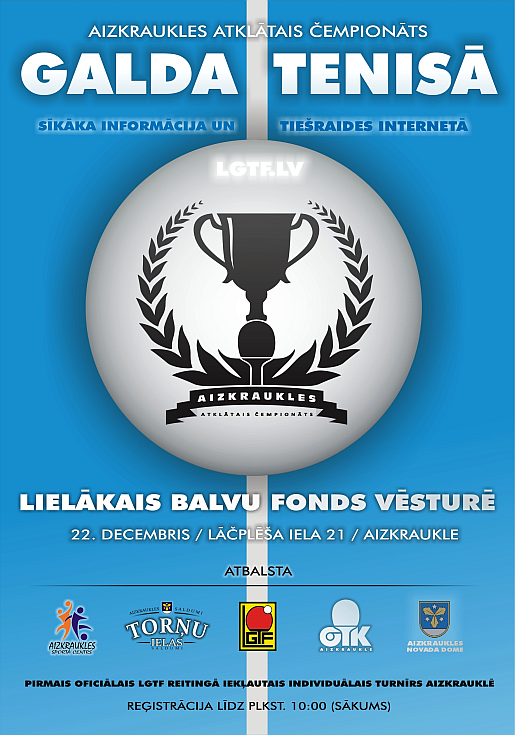 Šajās svētku brīvdienās, 22. decembrī norisinās Aizkraukles pilsētas atklātais čempionāts galda tenisā 2018. Jūs gaida moderna sporta halle un lieliskas balvas, atbrauciet un piedalieties!
