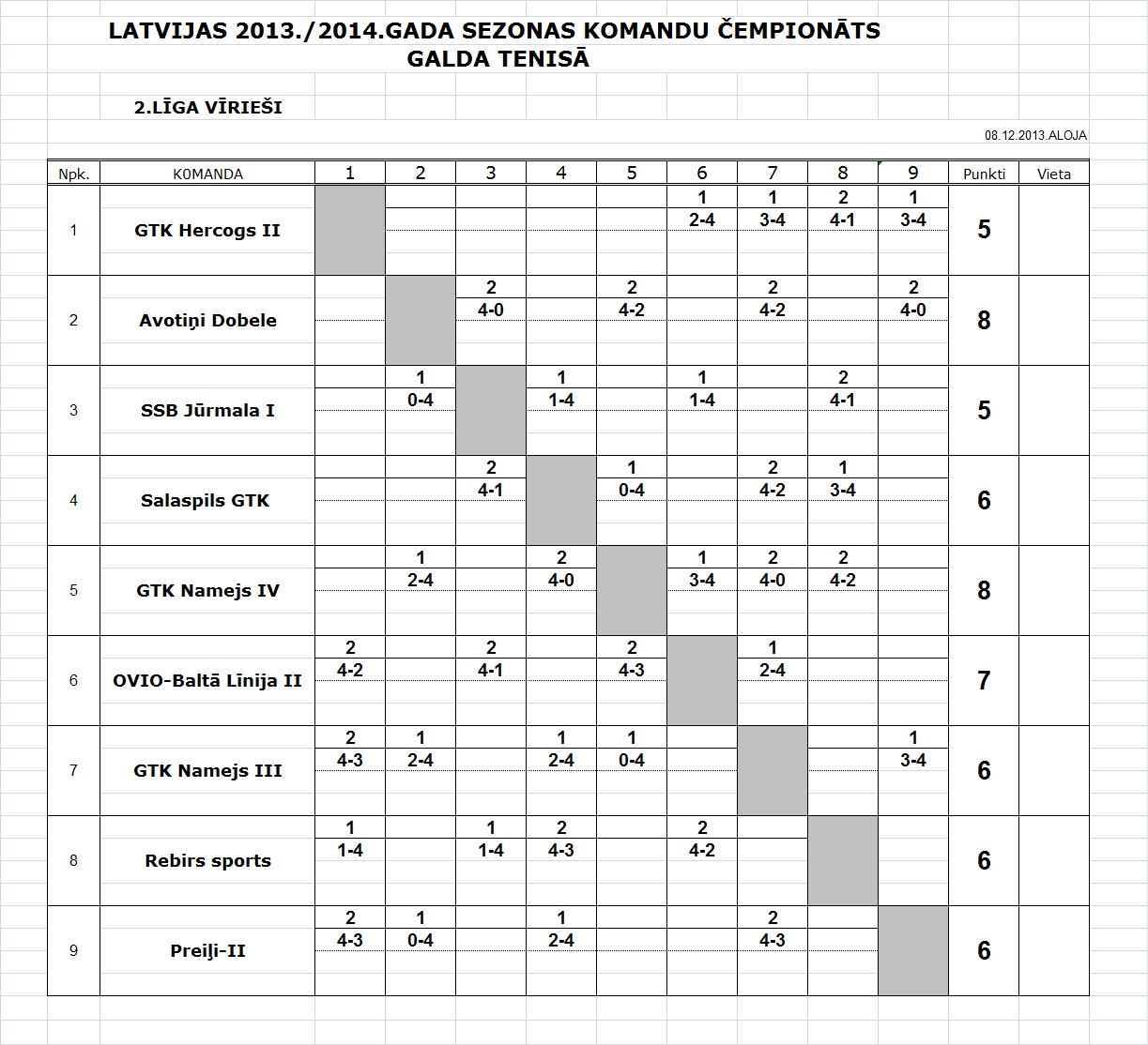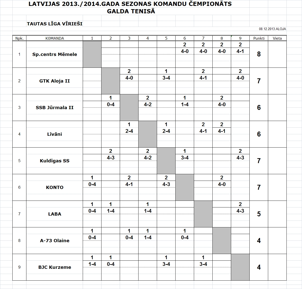 Командный чемпионат Латвии по настольному теннису сезона 2013/2014 годов продолжается, 3-й съезд для мужчин пройдет 8 февраля 2014 года в спортивном центре Кулдиги, ул. Пилтенес, 25 в Кулдиге.